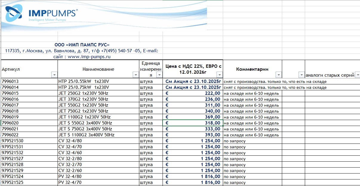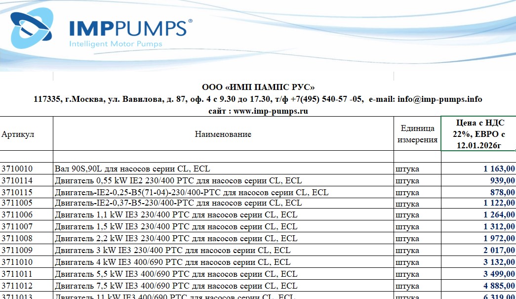 Информируем Вас о том, что с 12 января 2026 года вступает в силу новый прайс-лист на весь ассортимент насосного оборудования IMP PUMPS.
